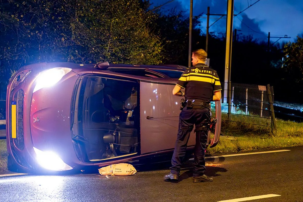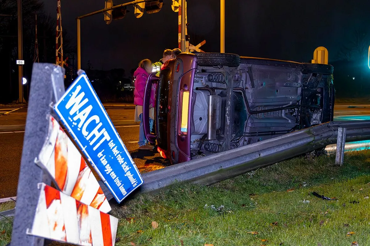 VELSEN NOORD - Een automobiliste is in de nacht van woensdag op donderdag met de wagen gekanteld in Velsen-Noord. Even na half een ging het mis op de Velsertraverse. De wagen kwam ter hoogte van de spoorwegovergang op z’n kant tot stilstand.