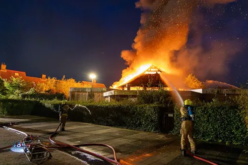 20.15 uur brand uitgebroken. De vlammen slaan uit het pand en de brandweer