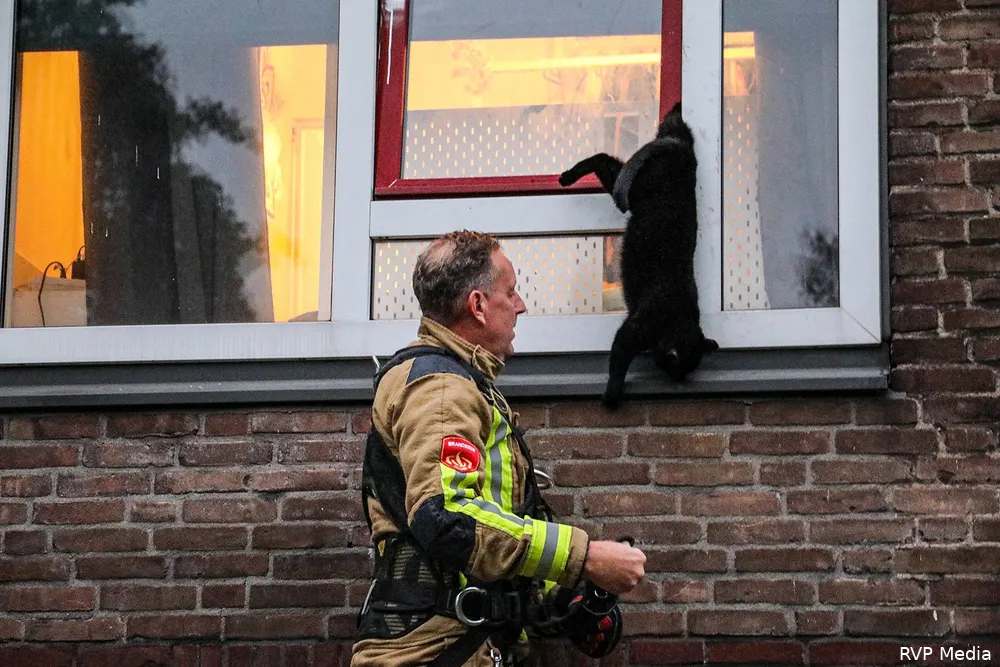 De kat had geprobeerd via het raam naar buiten te springen, maar kwam daarbij klem te zitten. De bewoners probeerden het dier zelf te bevrijden, maar dat lukte niet, waarna ze de brandweer inschakelden.