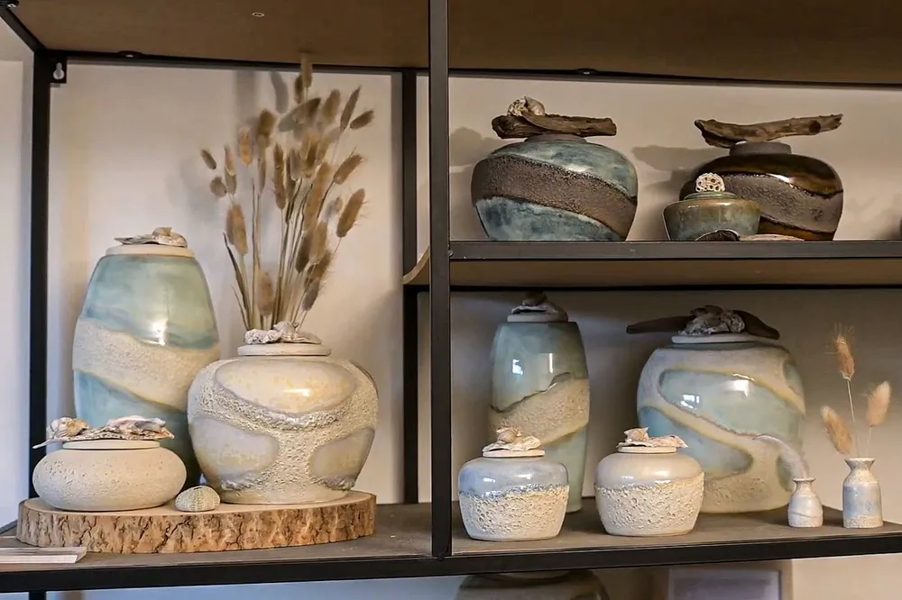 WIJK AAN ZEE - Toen Cynthia van der Waard in 2009 haar vader verloor, besloot zij zijn urn zelf te beschilderen. “Door zelf te ervaren hoe belangrijk een mooi tastbaar gedenkteken is, wilde ik dat ook voor anderen maken,” vertelt zij. Wat begon in een periode van rouw, groeide uit tot het maken van keramische urnen waarin het strand een terugkerend thema vormt.