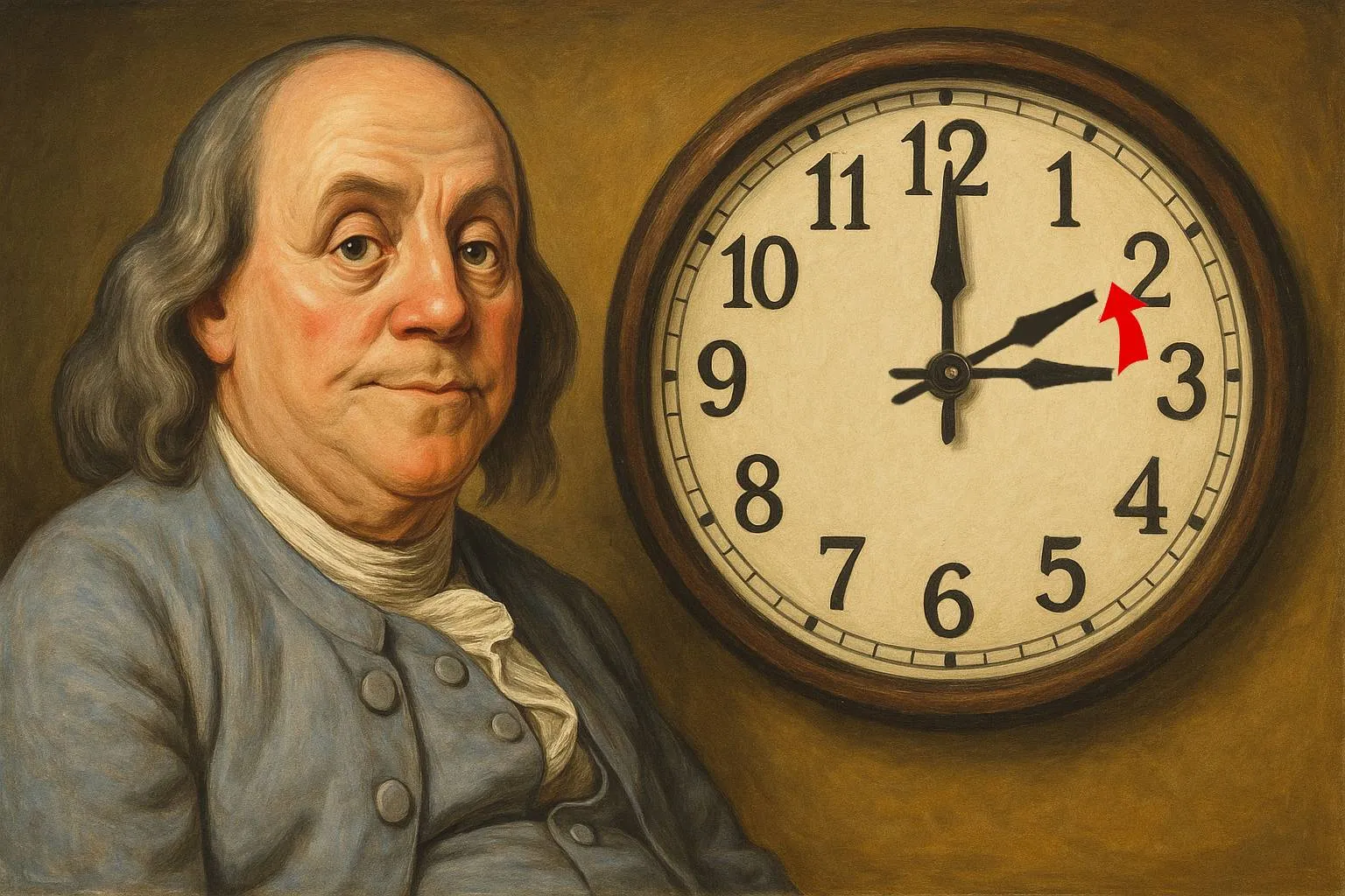 Ik heb het sterke vermoeden dat Benjamin Franklin nooit heeft stilgestaan bij dit verschijnsel. In ieder geval heeft hij er genoeg kaarsen mee bespaard om er voor ieder ‘zomertijd-slachtoffer’ eentje op te steken.