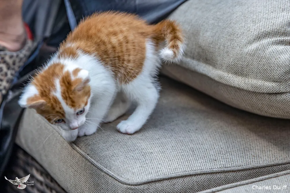 Het zou ruim twee uur duren voordat hij voorzichtig zijn knappe koppie weer liet zien en schichtig begon aan verkenning van zijn nieuwe omgeving. Zo begon een spannend avontuur, zeker ook voor mij. In de eerste plaats de kattenbak. Daar was hij helemaal niet aan gewend. Ik schreef het al, hij had er wel één, maar ging altijd naar buiten om zijn behoefte te doen.