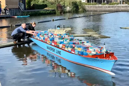 wegende model van een Maersk containerschip dat in twee delen vervoerd werd en