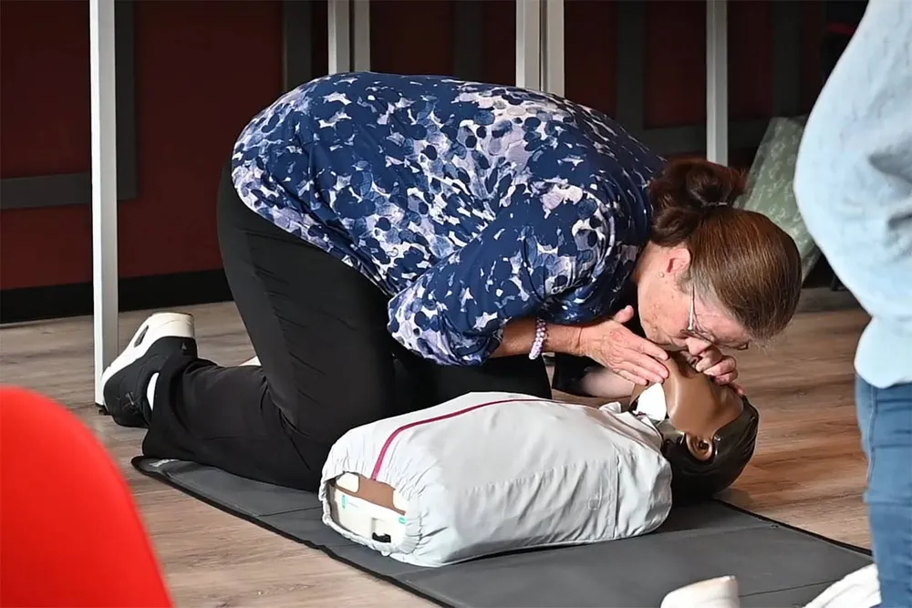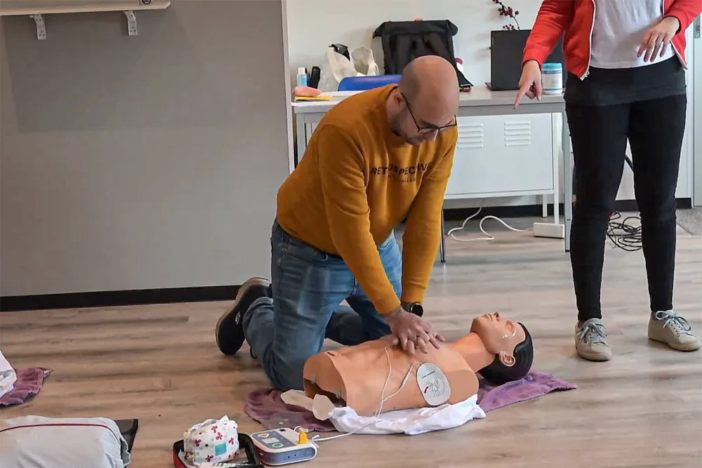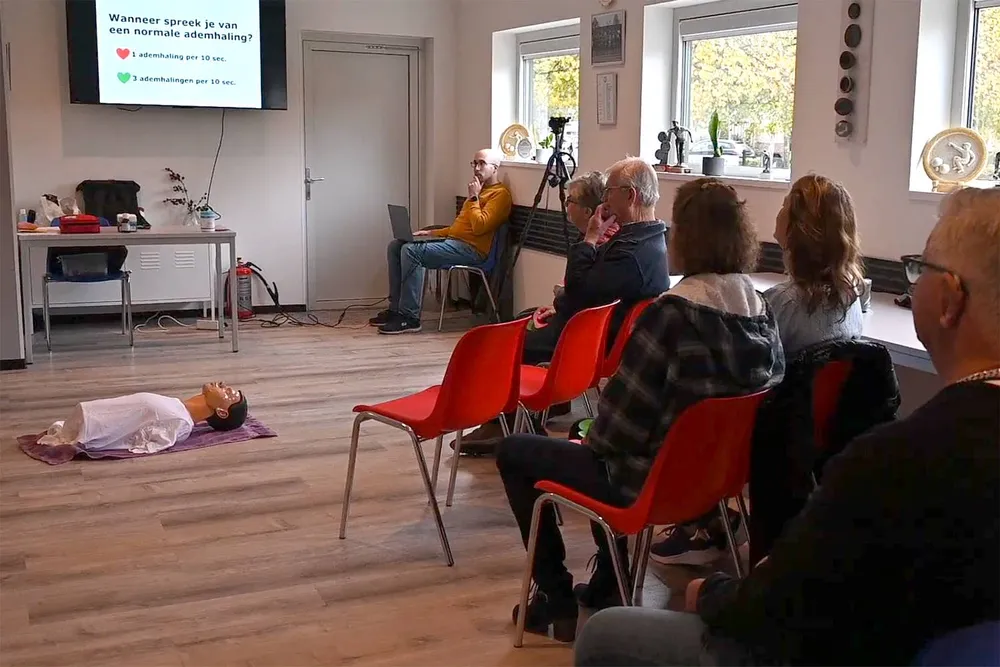 Instructeur Miriam vertelt alles over het herkennen van signalen van een hartstilstand, het alarmeren van 112 en het uitvoeren van borstcompressies en beademing. Ook benadrukt zij het belang van begeleiding door de meldkamer en samenwerking met professionele hulpverleners zodra die ter plaatse zijn.