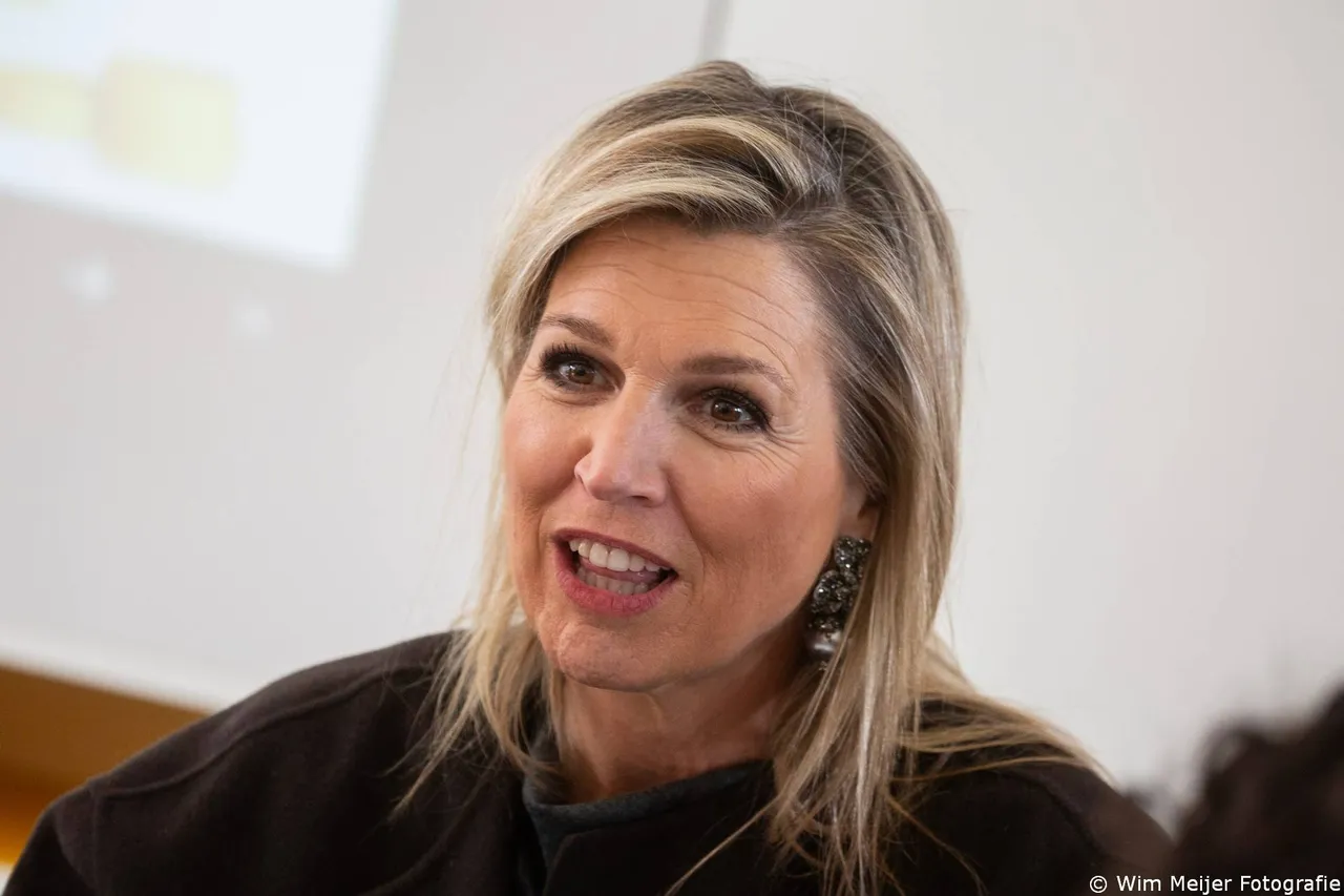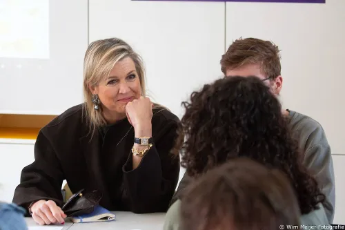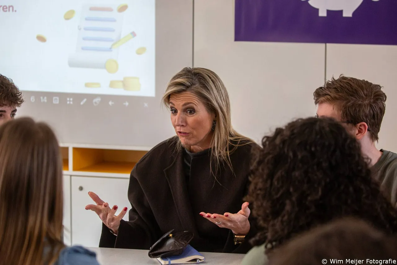 Máxima is erevoorzitter van Wijzer in geldzaken. In haar rol heeft de koningin aandacht voor financiële educatie en financiële gezondheid. Tegen een groep rectoren en mentoren van het Coornhert Lyceum sprak Máxima het doel uit om alle kinderen "financieel geletterd" te maken.