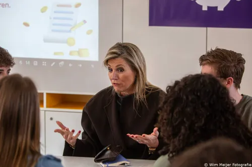 Met de leerlingen van 3 havo ging de koningin in gesprek over de impact van reclames en influencers op geldkeuzes. De docent vroeg zijn leerlingen wie wel eens een volstrekt onnodige aankoop had gedaan. Daarop staken alle leerlingen hun hand op, net als Máxima. Vervolgens ging Máxima in gesprek met leerlingen uit 5 vwo. Tijdens dat gesprek stond centraal wat achttienjarigen te wachten staat als zij zelf verantwoordelijk worden voor hun financiën.