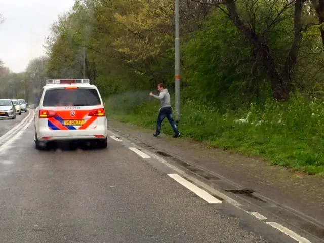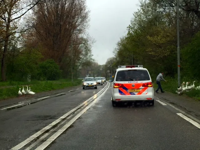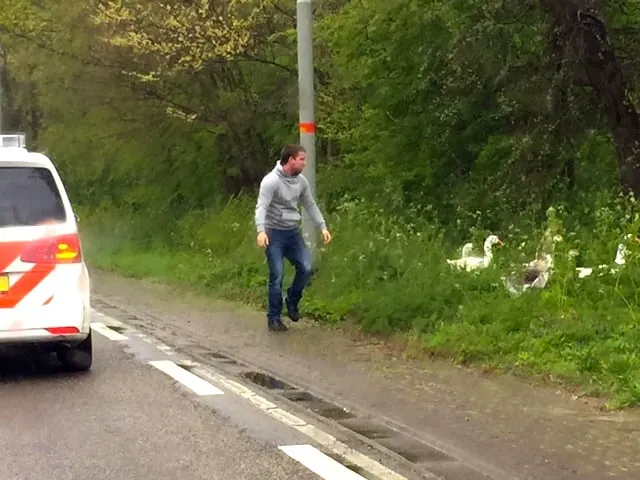Om aanrijdingen met de wandelende vogels te voorkomen stapte één van de wachtende automobilisten uit om de ganzen te begeleiden naar de kant van de weg. Met succes want in een kort tijdsbestek stuurde hij de witte tweevoeters naar de zijkant van de weg en kon iedereen, inclusief een dienstwagen van de politie, zijn weg weer vervolgen.