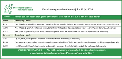 Iedere week publiceert Nieuws.nl de gevonden en vermiste dieren in en rond Beverwijk, Heemskerk, Castricum en Uitgeest op basis van de gegevens van Stichting Dierenambulance Kennemerland en Stichting Amivedi.