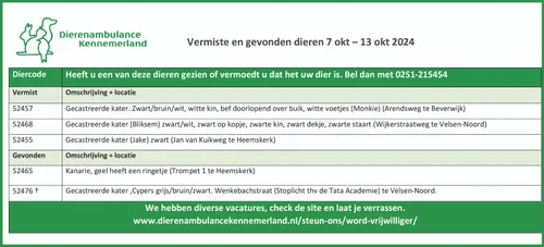 Vermiste en gevonden dieren gemeld bij of gevonden door