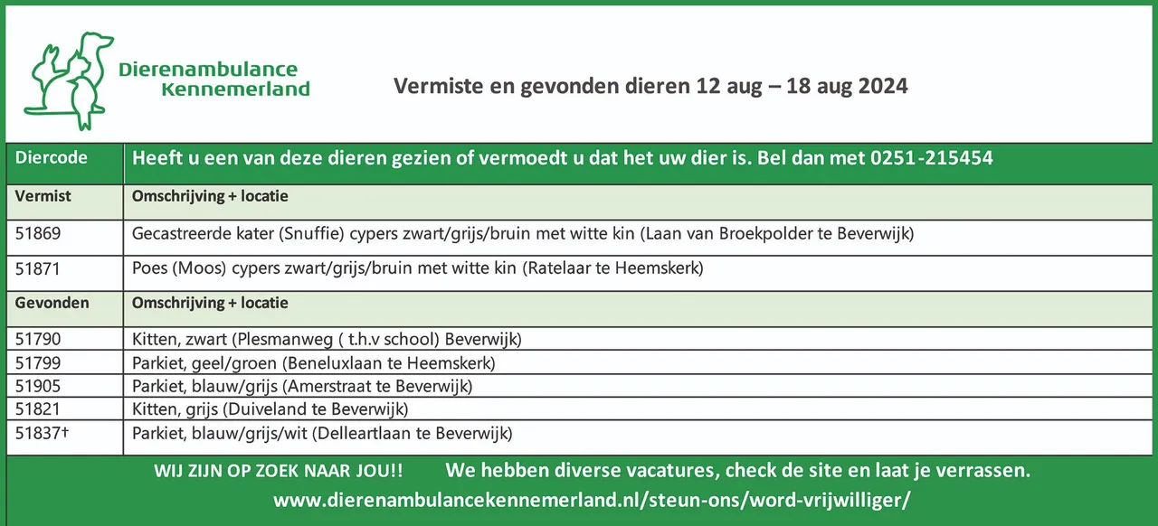 Iedere week publiceert Nieuws.nl de gevonden en vermiste dieren in en rond Beverwijk, Heemskerk, Castricum en Uitgeest op basis van de gegevens van Stichting Dierenambulance Kennemerland en Stichting Amivedi.