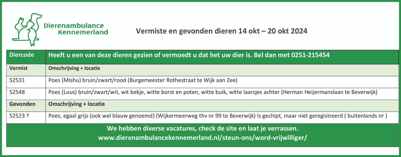 Iedere week publiceert Nieuws.nl de gevonden en vermiste dieren bin en rond Beverwijk, Heemskerk, Castricum en Uitgeest op basis van de gegevens van Stichting Dierenambulance Kennemerland en Stichting Amivedi.