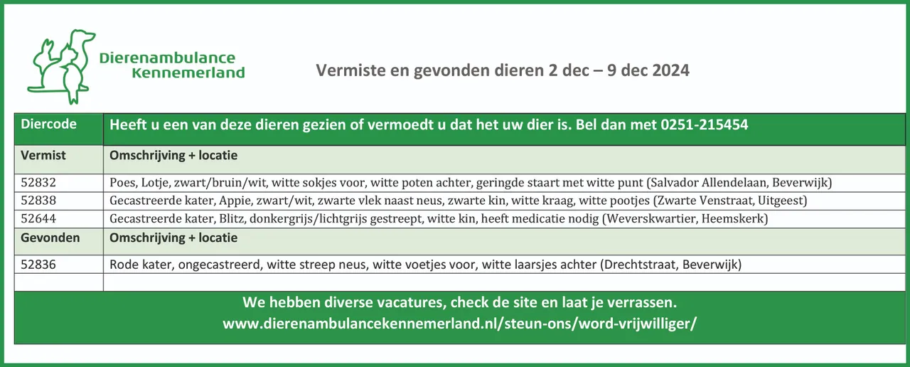 Iedere week publiceren Nieuws.nl en IJmond Nieuws de gevonden en vermiste dieren in en rond Beverwijk, Heemskerk, Castricum en Uitgeest op basis van de gegevens van Stichting Dierenambulance Kennemerland en Stichting Amivedi.