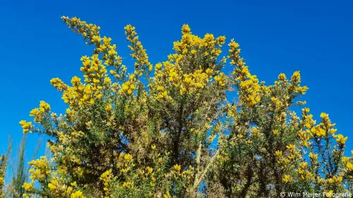 Het geel is van de gaspeldoorn, een struik die vooral gelukkig wordt van ‘schrale grond’ zoals heidevelden en duinen. Qua bloei is ’t een ongeduldige jongen, want soms begint de struik al in de winter te bloeien. Maar het hoogtepunt van de bloei is toch wel nu tot in mei.