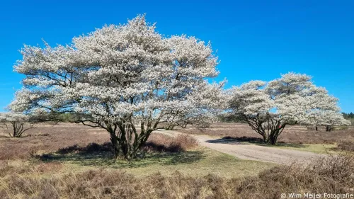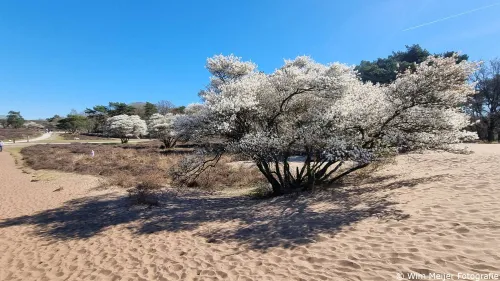 Maar vooral ook veel wit op de heide. Wit, door de vele krentenbomen, ofwel de amelanchieren. De boom heeft een aantrekkelijke en sierlijke uitstraling, vooral in de lente wanneer hij bloeit met mooie witte bloemen. De bloei duurt 2 tot drie weken, dus wil je meegenieten van deze bloesempracht dan moet je niet te lang wachten.