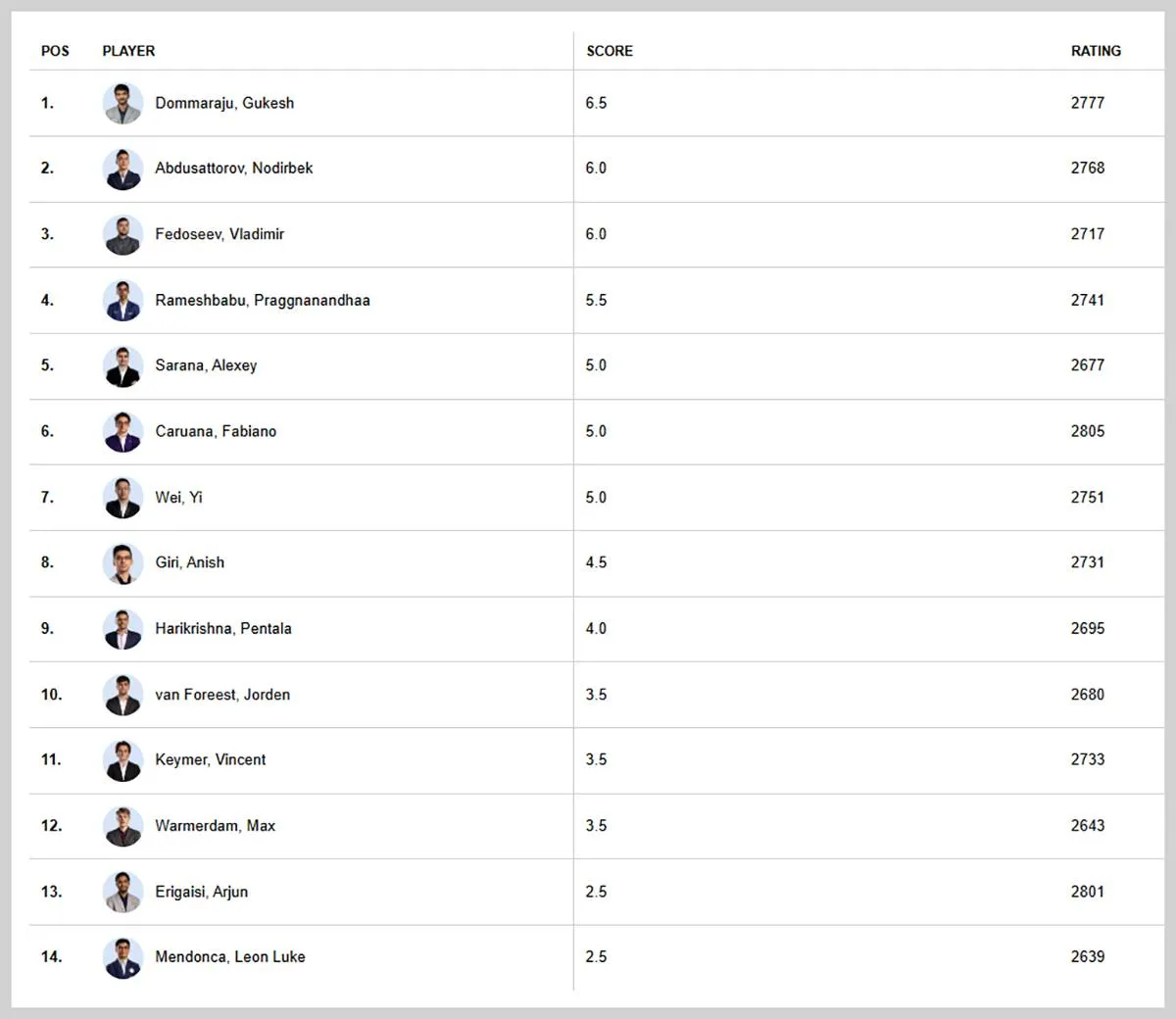 Wereldkampioen Dommaraju Gukesh, eveneens afkomstig uit India, is nu alleen leider. Door een zege op zijn landgenoot Leon Luke Mendonca kwam de 18-jarige grootmeester op 6,5 punten. De Oezbeek Nodirbek Abdoesattorov volgt na een remise tegen de Amerikaan Fabiano Caruana met 6 punten, net als Vladimir Fedosejev, de Rus die tegenwoordig voor Slovenië uitkomt. Hij versloeg de Indiër Pentala Harikrishna.